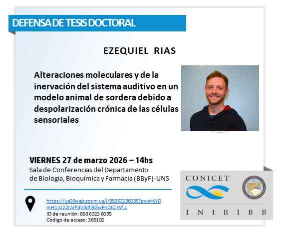 Tenemos el agrado de comunicar que el *Bioq. Ezequiel Rías*llevará a cabo la defensa de su tesis para optar por el título de *Doctor en Bioquímica*.
