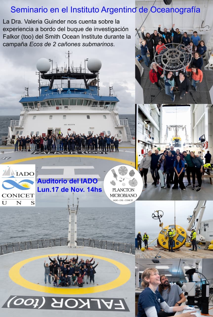 Compartimos la invitación a participar hoy, lunes 17 de noviembre, a las 14 h, de un seminario informal en el que *la Dra. Valeria Guinder compartirá su experiencia a bordo del buque de investigación Falkor (too) del Schmidt Ocean Institute*, durante la reciente campaña “Ecos de 2 cañones submarinos”.