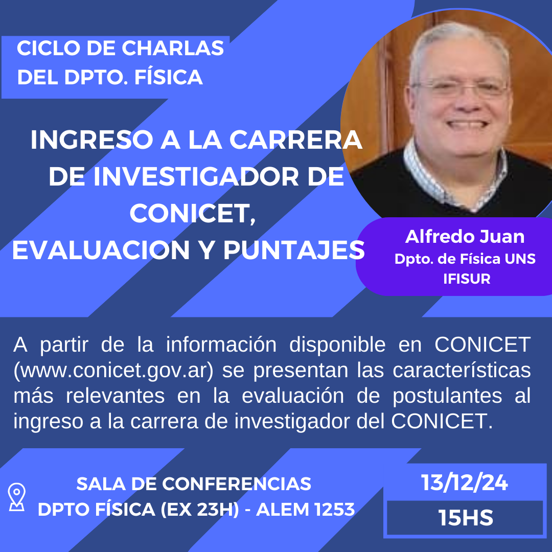Tenemos el agrado de invitarlos al seminario que dictará el Dr. Alfredo Juan, referida al "Ingreso a la carrera de Investigador de CONICET, evaluación y puntajes" A partir de la información disponible en CONICET (www.conicet.gov.ar http://www.conicet.gov.ar) se presentan las características más relevantes en la evaluación de postulantes al ingreso a la carrera de investigador del CONICET. Si bien este seminario está mayormente orientado a las áreas de Ciencias Exactas y Naturales e Ingenierías, los criterios generales se pueden extender a Ciencias Biológicas y de la Salud y a Ciencias Sociales y Humanas. El seminario está particularmente orientado a quien esté pensando en postularse al ingreso o esté transcurriendo las etapas finales de su doctorado o iniciales del postdoctorado. En el caso de las antecedentes se hará énfasis en la calificación de las publicaciones, el plan de trabajo, la formación académica del postulante y la entrevista (en el caso que se requiera) Se presentará un caso (ejemplo) exitoso de ingreso y se discutirán los errores mas comunes en las postulaciones.(adjuntamos resumen).
