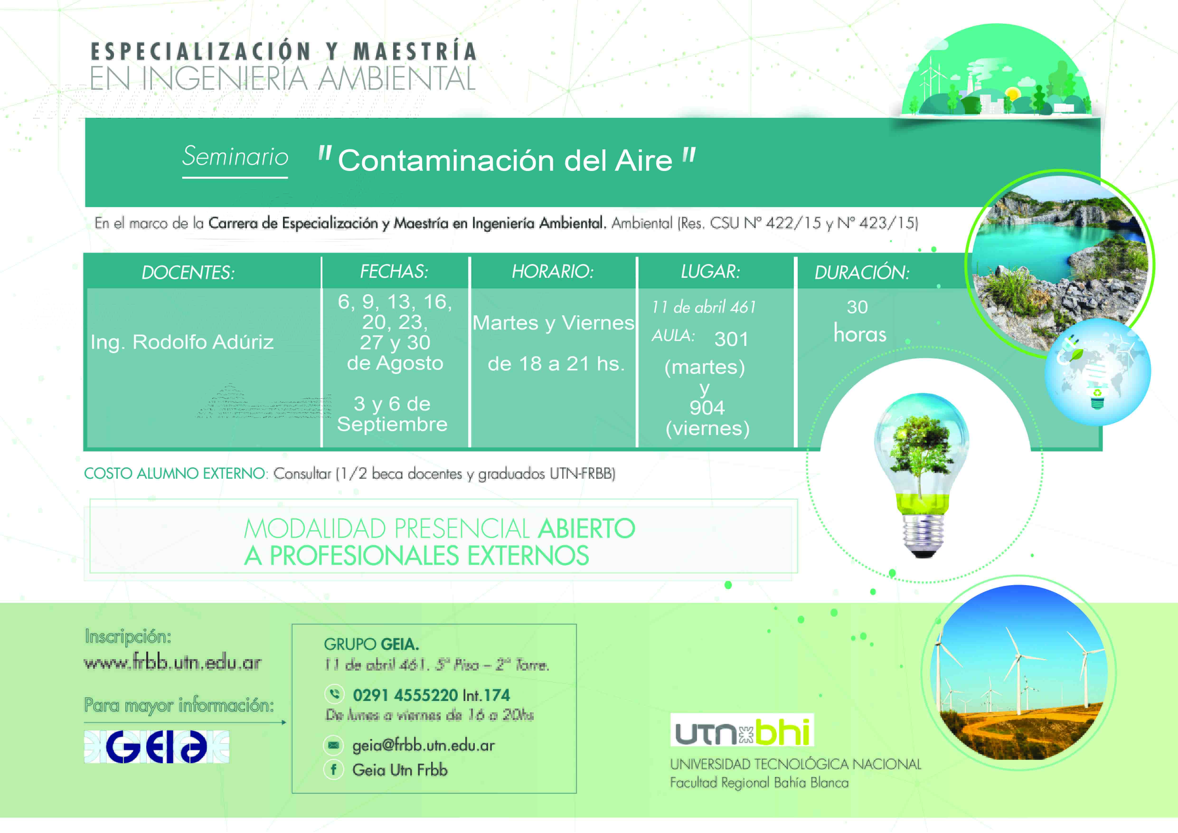 Se agradece difusión del Seminario ?Contaminación del aire? que se dictará a partir del 6 de agosto, en el marco de la carrera de Especialización y Maestría en Ingeniería Ambiental, abierto a alumnos externos.