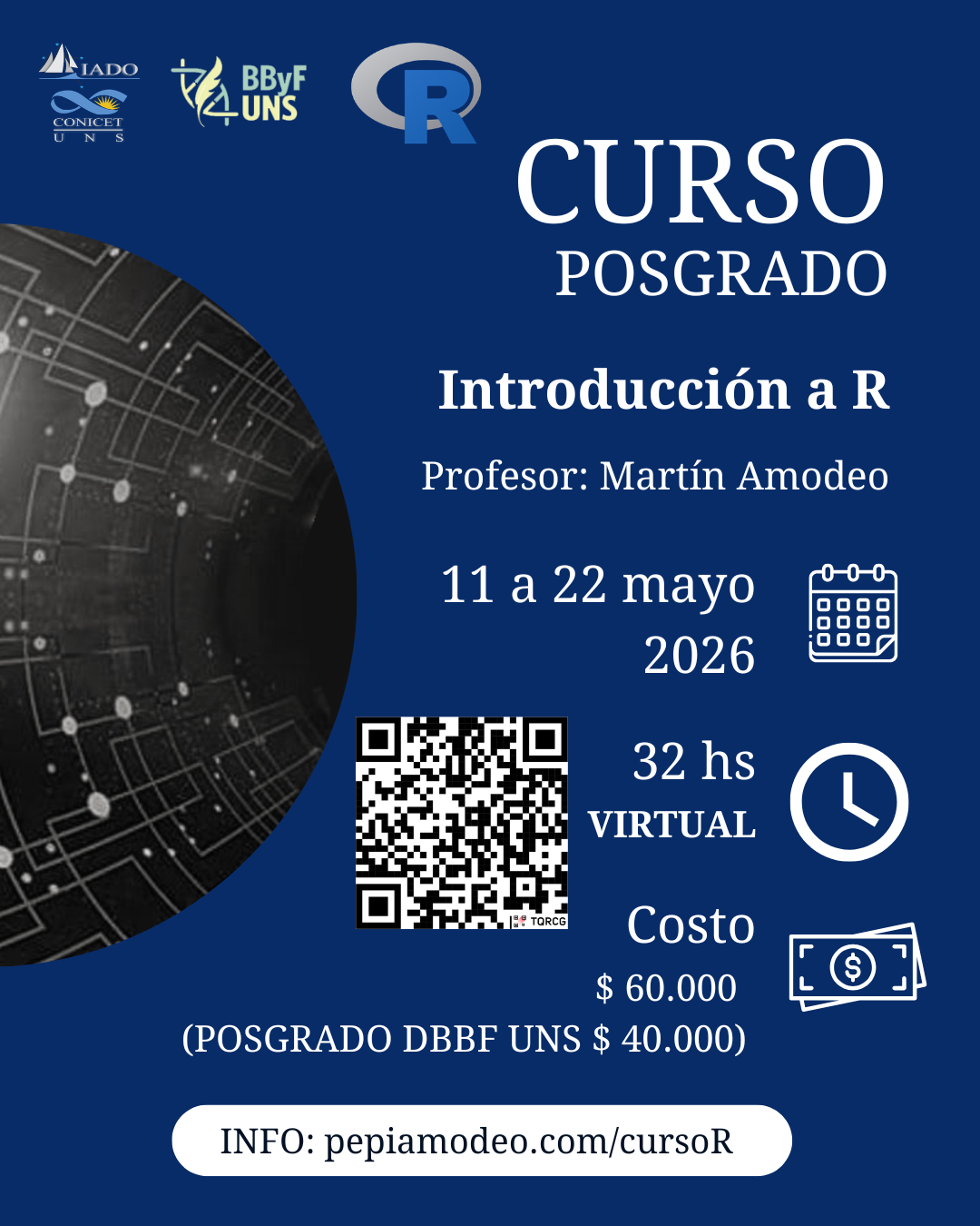 Les enviamos información sobre el curso de posgrado “Introducción a R”, dictado por el Dr. Martín Amodeo. Curso teórico-práctico que ofrece los fundamentos básicos necesarios para llevar a cabo el procesamiento y análisis de datos más habituales en las ciencias biológicas y ambientales, utilizando el software R. El curso está destinado a becarios/as doctorales y post-doctorales, así como investigadores/as, profesionales y docentes de instituciones científicas públicas. *Modalidad virtual* Del 11 al 22 de mayo 2026. Lunes, miércoles y viernes de 9:00 a 12:00