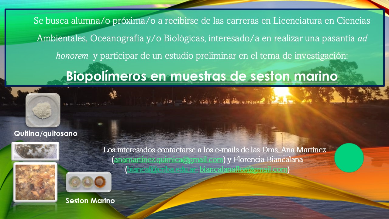 Se busca alumno/a próximo/a a recibirse de las carreras de Licenciatura en Ciencias Ambientales, Oceanografía y/o Ciencias Biológicas interesado/a en realizar una pasantía ad honorem y participar de un estudio preliminar en el tema de investigación "Biopolímeros en muestras de seston marino"