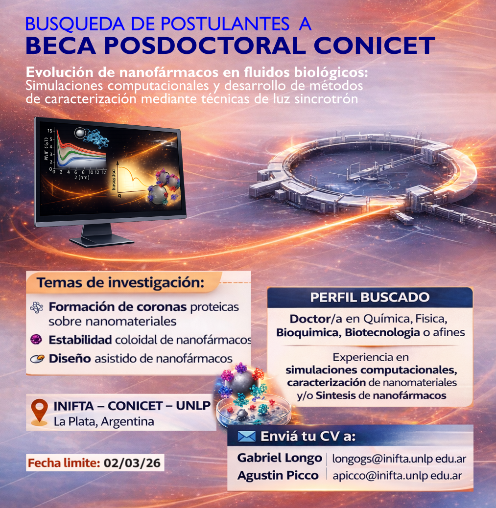 Compartimos la búsqueda de interesados/as en postularse a beca posdoctoral CONICET para incorporarse a proyecto enfocado en el estudio de interacciones entre nanoestructuras y macromoléculas biológicas.