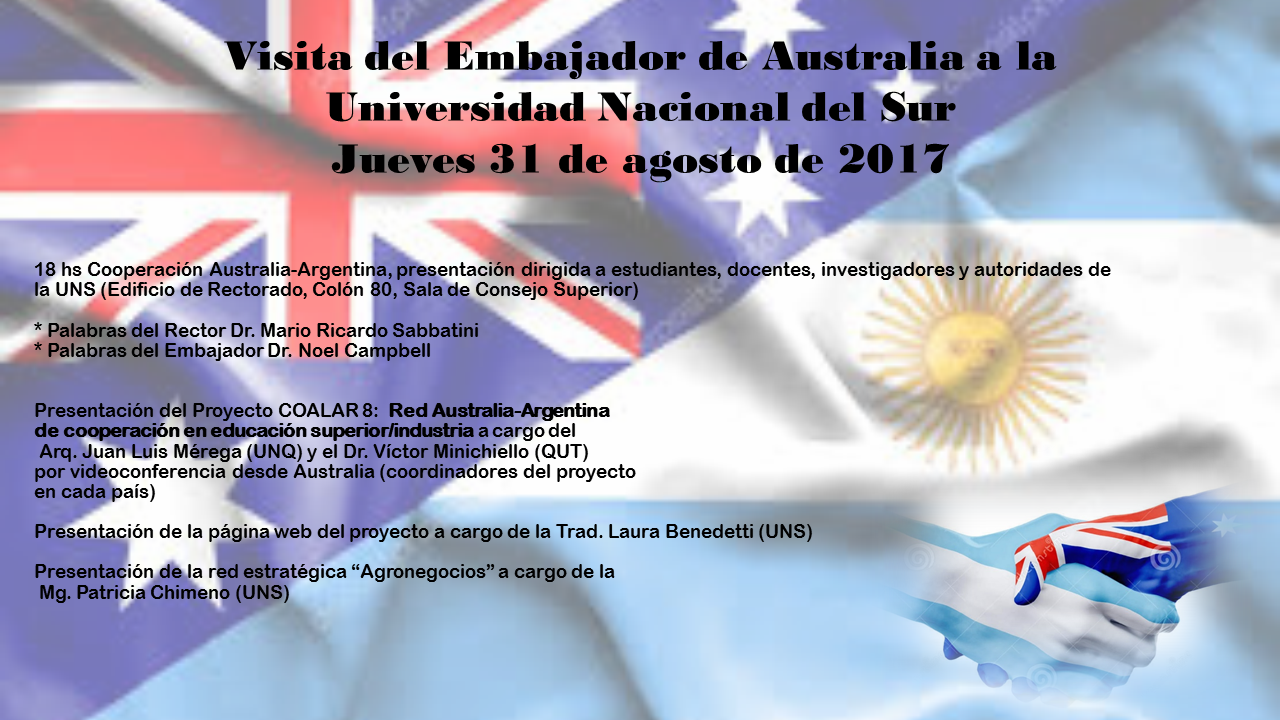 Este jueves a las 18 hs el Embajador de Australia brindará una charla sobre posibilidades de cooperación Argentina-Australia. En el afiche adjunto encontrarán toda la información y rogamos se inscriban en el siguiente link: https://goo.gl/forms/WOK4viT2fehMDIUY2
