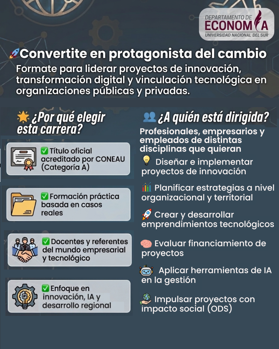 ✔ Título oficial acreditado por CONEAU (Categoría A) ✔ Formación práctica basada en casos reales ✔ Docentes y referentes del mundo empresarial y tecnológico ✔ Enfoque en innovación, IA y desarrollo regional